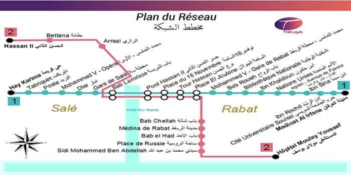 – The main urban line extends from the Karima district in Salé to the Al Irfane district in Rabat, covering a distance of 11.7 km. It serves the main hubs of both cities through 22 stations, with a total travel time of 36 minutes.